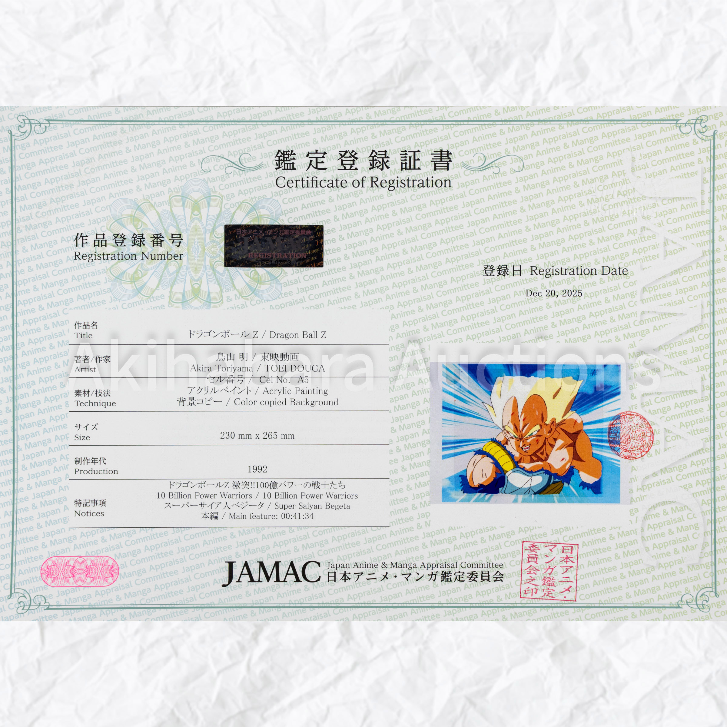 Main feature: 00:41:34 A5 Vinegar smell: (-) Waving: (-) Shrink: (-) Sticked: (-) Color copied Background With JAMAC authentication certificate